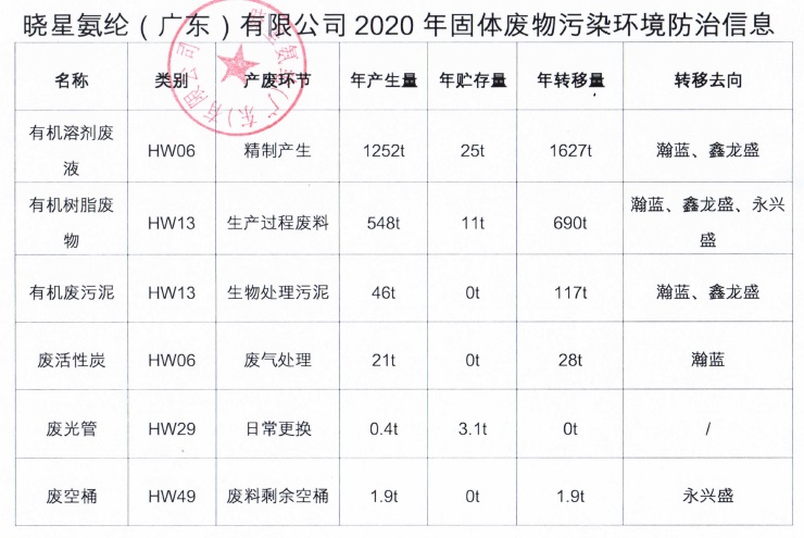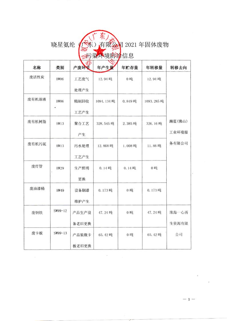 晓星氨纶(广东)有限公司2021年固体废弃物污染环境防治信息